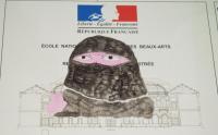 על השלט בכניסה צייר מישהו מתחת לדיוקנה של מריאן, סמל הרפובליקה הצרפתית, דיוקן של אשה מוסלמית רעולה