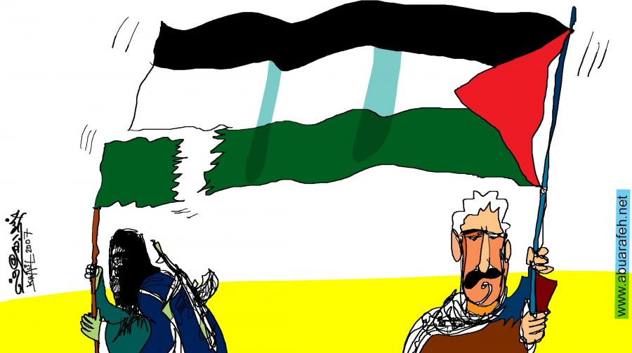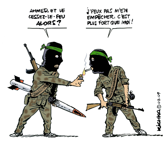 Mon dessin est un clin d'oeil a celui de mon collégue de Jérusalem-Est, Khalil Abu Arafeh, dessinateur a "Al Kouds", le grand quotidien palestinien. Il l'a publié en Juin 2007 quand le Hamas provoquait la cission au sein du peuple palestinien.