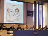 C'est le premier colloque de ce type dans un pays arabe. A la tête du Doha Center, Robert Ménard, fondateur de "Reporters Sans Frontiéres". Il m'a invité a participer au débat "What specific role for media in promoting interreligious dialogue and mutual understanding", avec comme intervenants un avocat égyptien spécialiste de la défense de la liberté d'expression dans son pays, une prof en International Human Rights Law de l'Université d'Oxford, un haut fonctionnaire de l'UNESCO et Robert Ménard lui-même. Comme modérateur, Alvito de Souza, membre de Signis, une association catholique laïque mondiale. Je représentais Israel mais aussi la Fondation "Cartooning for Peace" dont 6 autres dessinateurs assistaient a la conférence: Plantu (France), Boukhari (Ramallah), Glez (Burkina Faso), Stavro (Liban), Dilem (Algérie), Danziger (USA). Tous les grands médias du monde arabe, dont le puissant Al Jazeera opérant depuis Doha, étaient représentés. Les questions du blasphéme, du droit a la critique jusqu'a l'offense, des caricatures danoises de Mohamet, des caricatures et articles antisémites dans la presse arabe, du respect des Croyants mais pas des Croyances sans exception, ont été soulevées. Dans la salle était présent Flemming Rose, rédacteur du "Jylland-Posten" danois qui publia en 2005 douze dessins de Mahomet, qui une fois manipulés par des immams extrémistes, donnérent lieu en 2006 aux violences dont le monde entier se souvient. Dans cette photo prise par Plantu lors du débat, une image projetée montrant mon pére, survivant de Buchenwald, avec Ahmadinejad, ce dessin ayant été réalisé au moment ou l'Iran organisait en 2006 un concours international de caricature antisémites contre la Shoah.