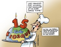 בשבוע שעבר חגג קיוסק 15 שנות שידור. קיוסק משודר בערוץ טי.וי 5 לכמאתיים חמישים מיליון צופים פרנקופוניים בכל העולם מתחנת השידור הנמצאת בפריס. התכנית היא בשידור חי בכל יום ראשון והיא דנה בנושאים אקטואליים בוערים בנוכחות כתבים זרים בכירים העובדים בצרפת. קיוסק גם מארחת קריקטוריסטים פעם או פעמיים בשנה כדי לדון במצב העולם בראי הקריקטורה. מומלץ בחום לדוברי צרפתית או למביני צרפתית או לשומעי צרפתית. למעוניינים כתובת האתר היא