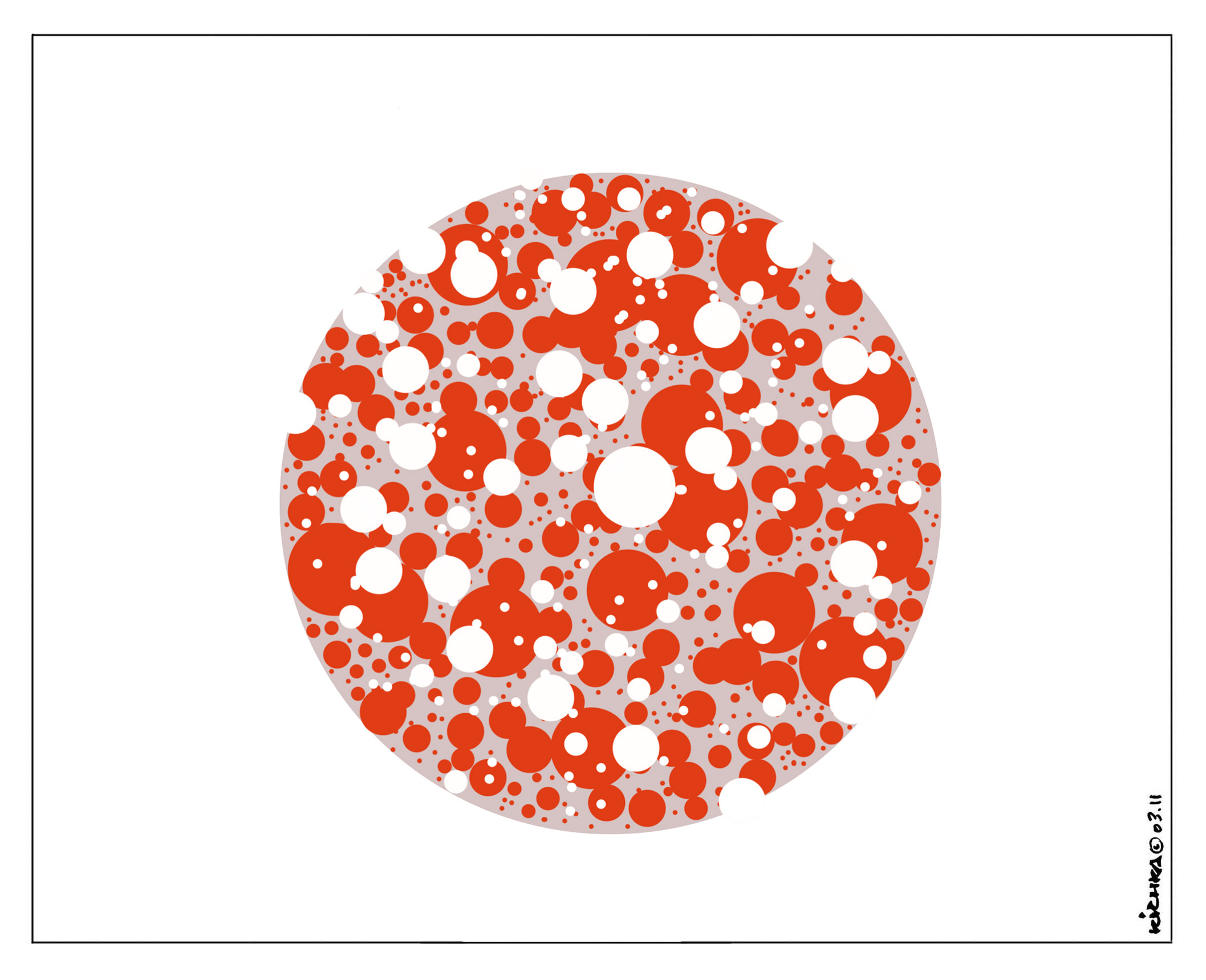 עמיתי בוריס ארנבורג מצייר על אסון הטבע שפקד את יפאן. אסון מתגלגל שהופך לאסון גרעיני ואקולוגי והומניטארי ככל שהימים עוברים. יש דרכים שונות להביע השתתפות בצערו, בסבלו ובאבלו של העם היפאני. בוריס בחר ללכת לכיוון ההומור השחור כאשר החליט להלביש למלאך המוות אף אדום של ליצן. כך יוצא שהמוות צוחק ליפאן בפרצוף ומכה בה ללא רחם. הביקורת היא על מלאך המוות שמנסה להסתתר מאחורי חיוך ציני של פורים. הטיפול הגרפי של בוריס מתומצת ,חריף ועצמתי. לא מתייפייף ולא מתחנחן