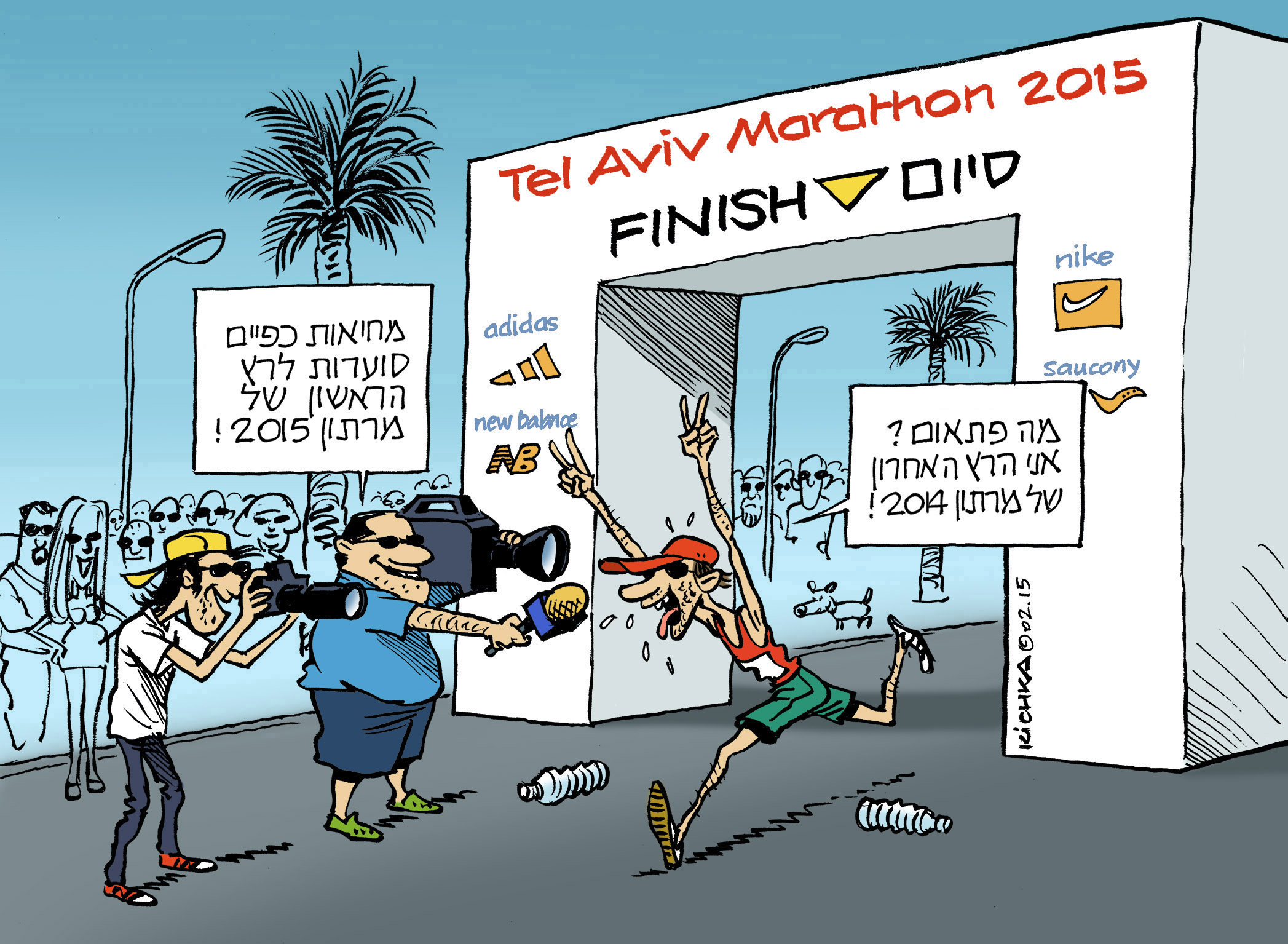 מחר יום שישי מתקיים המרתון של תל אביב. תחזית מזג האוויר תהיה אביבית ומעלה, מה שיקשה על הרצים. מלבד המרתון, ירוצו גם חצי מרתון, 10 ק"מ ו-5 ק"מ, לפי היכולת. הנהגים יקטרו כתמיד אך אוהבי האירועים בעיר הלבנה יהנו מיום רבוי באדרנלין ובזיעה. אז שיהיה בהצלחה לכל הרצות והרצים, ולאשתי אוליבה הרצה את עשרת הקילומטר בפעם הרביעית נב: את האיור יש לקרוא משמאל לימין