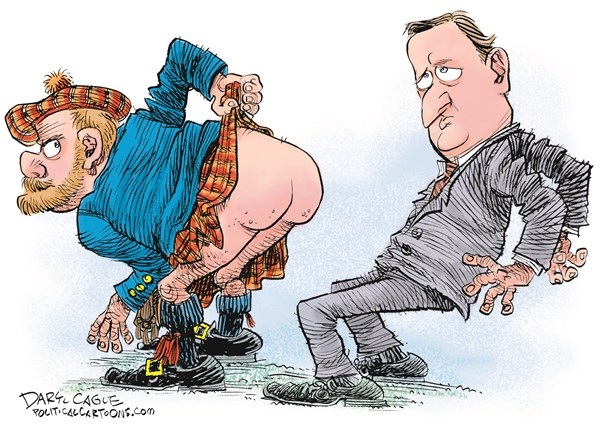 לצייר את ביבי ושרה מפליצים, קרי מוציאים גזים, היא מטפורה מאוד גרוטסקית, כבדה ולא אנינה במיוחד, נכון, אבל היא לגיטימית ועושה את מה שקריקטורה יודעת וצריכה לעשות. אגב ביבי ושרה הם לא הראשונים שצויירו מפליצים וגם לא האחרונים. כל מי שעומד במשרה רמה ובעמדת הנהגה חייב לקבל על עצמו את חוקי המשחק: החשיפה לביקורת, מכל סוג. כך לפחות נהוג במשטרים דמוקרטים. כדי לאשש את דברי, אני מפרסם כאן גם קריקטורה (מאת דריל קייגל) של דייויד קמרון מול סקוטי בדלני המפליץ בפרצופו ואחת (מאת דייב בראון) של טראמפ בסופר טיוזדיי. אף אחד באנגליה ובאמריקה הפוריטניות , לא ביקש לפטר את הקריקטוריסט, את עורך העיתון או את בעל העיתון