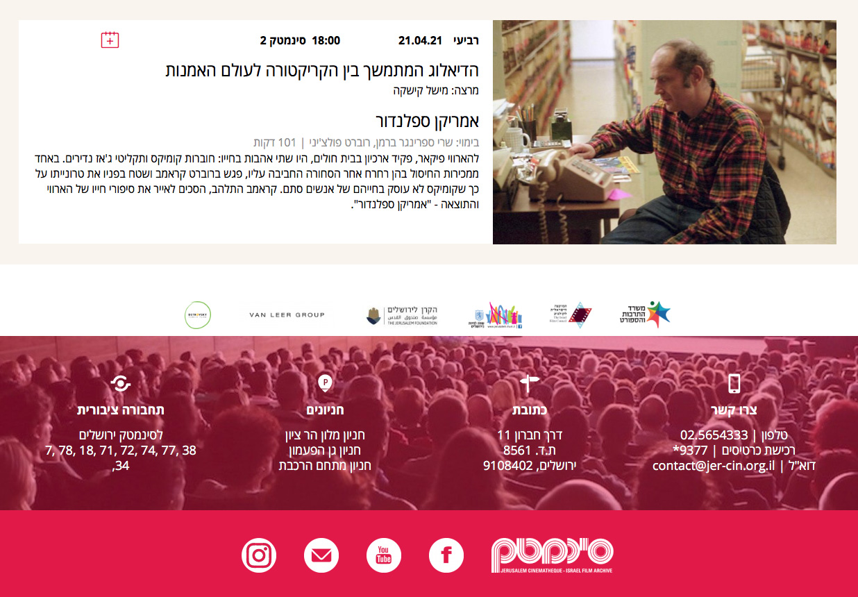 סינמטק ירושלים, מוסד אהוב עלי במיוחד, ישיק בקרוב סידרה חדשה תחת הכותרת ״אמנות בדיאלוג״. כל מפגש יכלול הרצאה בסוגייה מרתקת שתלווה בהקרנת סרט שייצור בעצמו דיאלוג עם ההרצאה. קונספט מעניין, עשיר ומעשיר