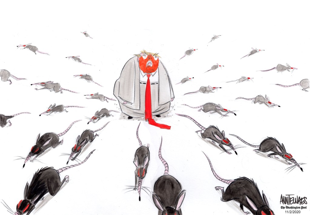 עמיתות ועמיתים שלי, קריקטוריסטים בארצות הברית, מגייסים את עפרונותיהם כדי לנסות להחליף את השלטון בדרך דמוקרטית. סטיב ברודנר העלה מחדש את הקריקטורה החזקה והקשה שהוא צייר בבחירות הקודמות. הטיים מגזין החילף את הולגו שלו בשער כדי לנסות לשכנע את הבוחרים ללכת לקלפי. אין לי ספק שהתקווה של העיתונות השפויה של ארצות הברית היא החלפת הדייר בבית הלבן