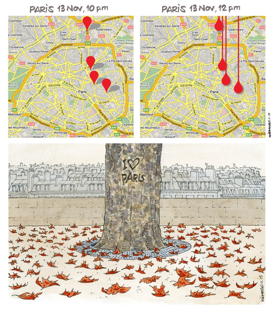באותו ערב, זמן רב לפני שהתקשורת יכלה לדווח על היקף הטבח, ערוצי הטלויזיה שידרו מפה של פריז ועליה סומן מסע ההרג של הטרוריסטים. זה נתן לי את הרעיון לציור הראשון. קריקטוריסט חייב להגיב גם כשנדמה שאי אפשר