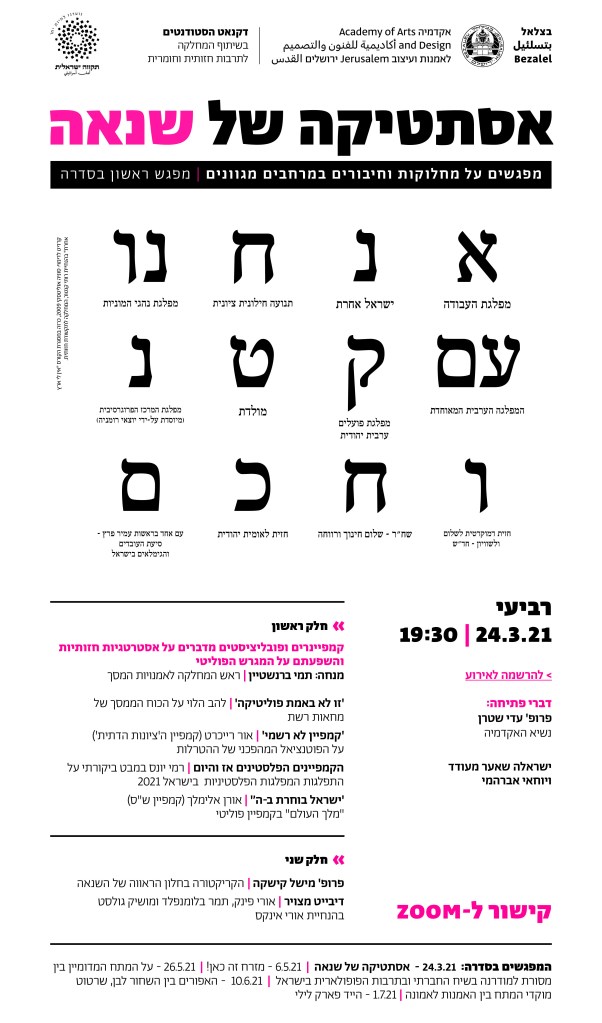 ביום רביעי הקרוב, יום אחרי סבב הבחירות הרביעי, תקיים האקדמיה בצלאל, אך עדיין בזום, ערב מיוחד סביב הנושא ״אסתטיקה של שנאה״. בחלק השני של הערב אתן הרצאה שכותרתה ״קריקטורה בחלון הראווה של השנאה״, עשירה בדוגמאות. אפרסם בקרוב קישור להרשמה