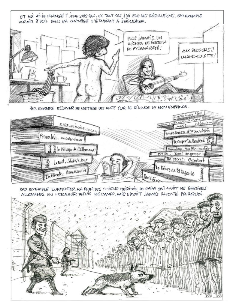 יום השואה עבר, היה טקס וביבי שוב דיבר על איראן, שוב הייתה צפירה וקיבלתי עוד ברווז. מרוב שהייתי עסוק בלהרצות על ״הדור השני״ בזום, לא הספקתי לאייר משהו מיוחד ולהעלות לבלוג. אז הלכתי לחטט בסקיצות של הספר ומצאתי שני עמודים שלא נכנסו בו, נשארו ״על ריצפת חדר העריכה״ כמו שאומרים בשפת הקולנוע, ואני משתף אותם כאן לראשונה