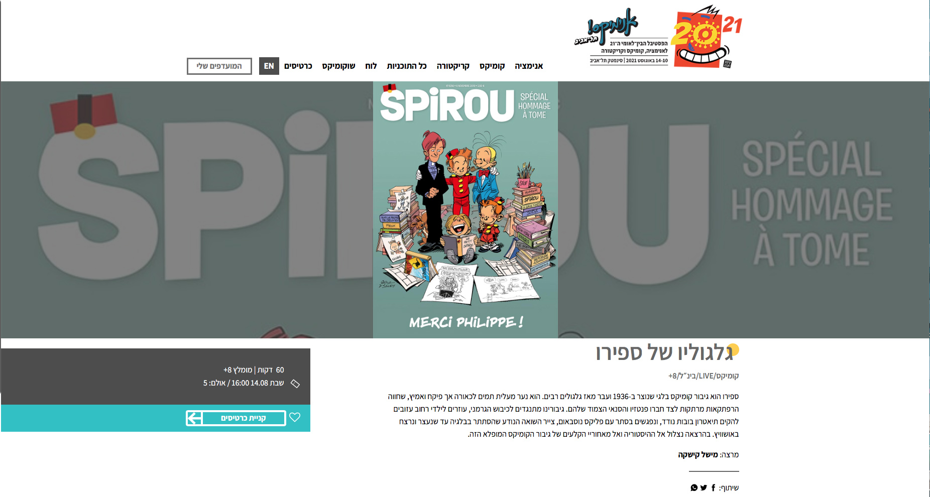 מחרתיים, שבת ה-14 באוגוסט בשעה 16.00, אתן הרצאה על גיבור הקומיקס הבלגי ספירו. הוא אמנם פחות מוכר מטינטין בעולם, אך הרפטקאותיו לא הפסיקו להתפרסם מאז שהוא נוצר בשבועון הנושא את שמו ב-1938. גיבור קומיקס עם פז״ם של 83 שנים ששומר על רוח נעוריו. אתן סקירה היסטורית של הקומיקסים שנוצרו במרוצת העשורים בידי יוצרים שונים עם דגש על שני יוצרים יוצאי דופן: פרנקן (ז״ל) המופלא ואמיל בראוו שמסיים בחודשים אלה סאגה בת 350 עמודים על ספירו בבלגיה הכבושה בידי הנאצים