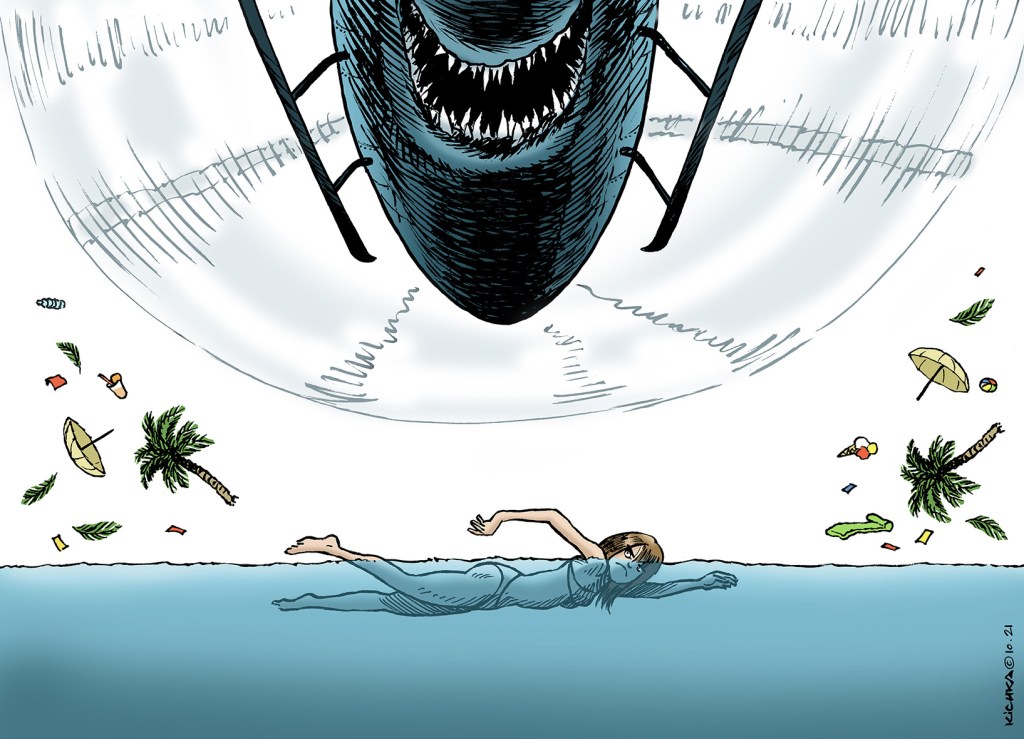 עיירת החוף רמטואל, שכית חמדה בריוויירה הצרפתית,סובלת מזה שנים מתנועה בלתי פוסקת של מסוקים המטיסים מעל ראשיהם של התושבים והנופשים, את המיליונרים והמיליארדרים אל המנחתים שבאחוזותיהם. מפגע אקולוגי מתמשך ובלתי נסבל של רעש וזיהום. במסגרת מאבקה בתופעה החליטה העירייה להכריז על תחרות קריקטורות בינלאומית.132 אמניות ואמנים מ-46 מדינות השתתפו בתחרות. ביום שישי זה התקיים בזום טקס הענקת פרסים. לשמחתי הרבה הקריקטורה ששלחתי זכתה במקום השני. ציירתי מעין קריצה פרודית לכרזת הסרט מלתעות כשהאיום בא לא מהים אלא מהשמיים