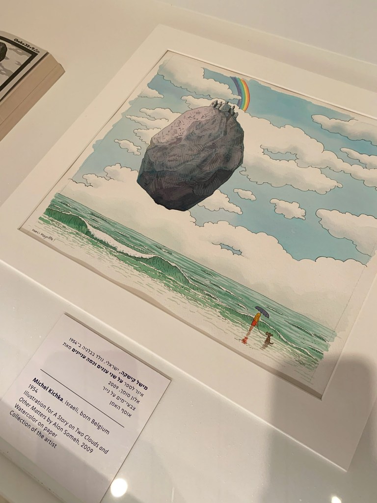 אמש נפתחה במוזיאון ישראל ירושלים התערוכה המקסימה ״לרחף עם מגריט״ שמתמקדת ביצירות שבהן מחרפים להם בקלילות עננים וסלעים. הקלילות היא בדיוק מה שאנו צריכים בתקופה קשה זו. האוצרת אפרת קליין הזמינה אותי להציג איור שציירתי ב-2009 עבור ספר הילדים של אלון סומך ״על שני עננים וכמה עניינים״ . איור שציירתי על פי הארמון בפירנאים שצייר מגריט ב-1959. יצירת מופת השייכת לאוסף המוזיאון. אני מנהל דיאלוג כפול עם מגריט בעבודתי כמאייר, קריקטוריסט ואמן קומיקס. כפול כי מגריט פתח שדה אפשרויות אין סופיות בעולם החזותי ואני אוהב לשאוב ממנו השראה וכי כמוהו, גדלתי בבלגיה ויש לי רגישות מיוחדת ליצירתו עוד מימי ילדותי. הים שמעליו מרחף הארמון הוא הים הצפוני שבחופיו ביליתי חופשות קיץ בילדותי ותחת שמיים מעוננים שז׳אק ברל שר עליהם בשירו המופלא הארץ השטוחה