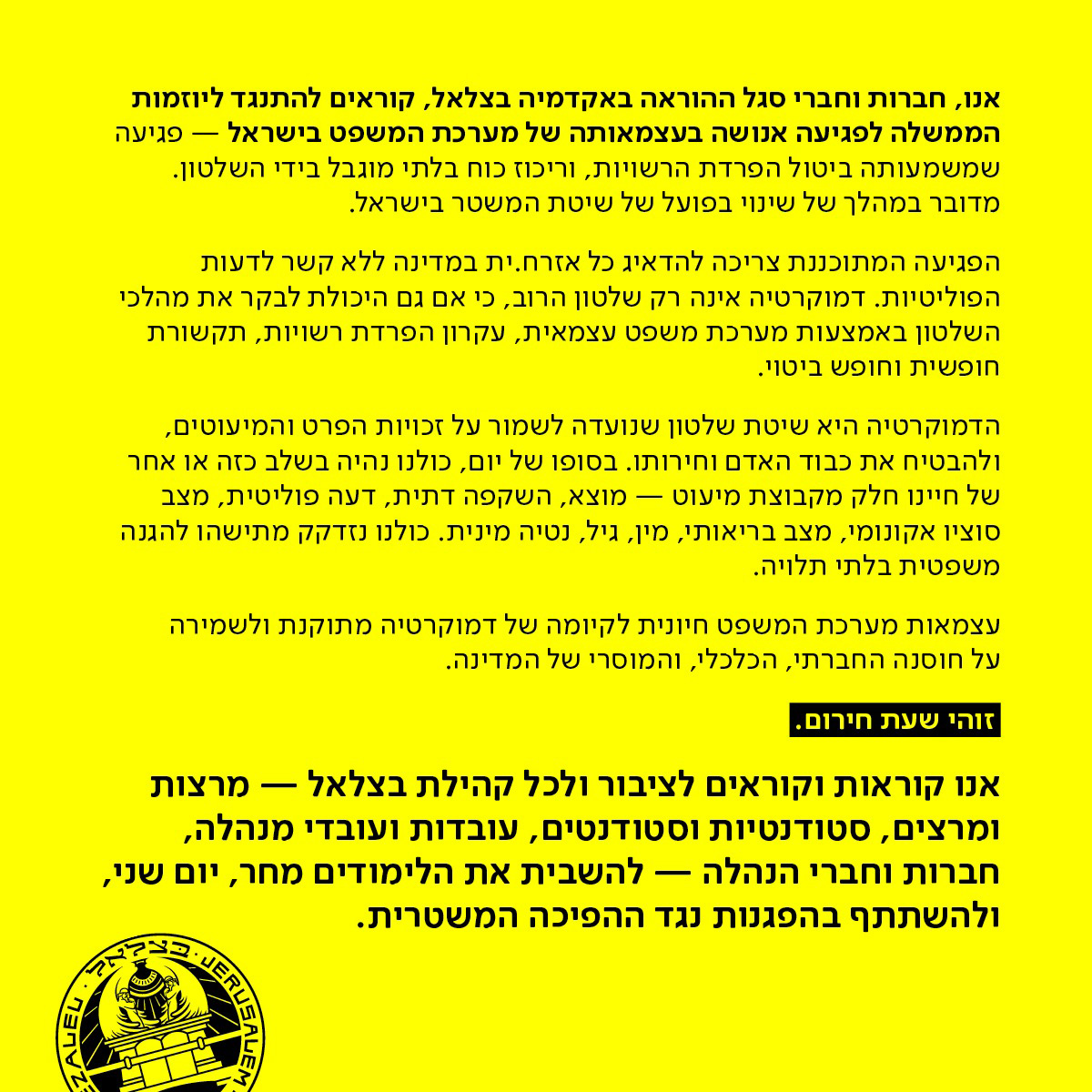 אנו קוראות וקוראים לציבור ולכל קהילת בצלאל – מרצות ומרצים, סטודנטיות וסטודנטים, עובדות ועובדי מנהלה, חברות וחברי הנהלה – להשבית את הלימודים ביום שני הקרוב ולהשתתף בהפגנות נגד ההפיכה המשטרית