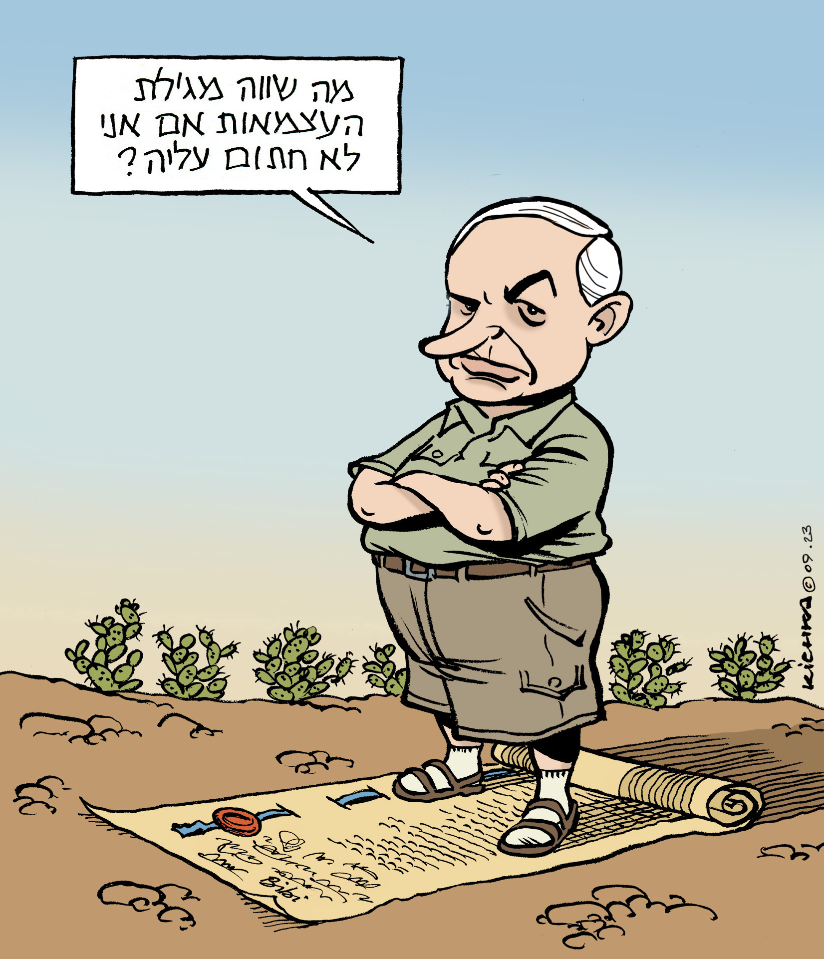 אם עו״ד בומבך שמייצג את הממשלה בעליון נגד העליון אומר שמגילת העצמאות נכתבה בחופזה ונחתמה על ידי שלושים ושבעה אנשים שלא נבחרו, מי אני שאגיד לו שהוא שומט את היסודות של הבניין שכולנו נתגוררים בו איכשהו? יש לו תוכנית תמ״א 38? או משהו בסגנון פינוי בינוי? מה הוא מתכנן שם: מבצר או בית קברות? אני שואל כי אני שומע את הדי-9 ומריח את הרעל שנפלט מהאגזוז