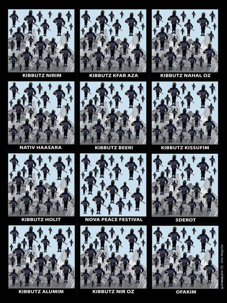איזה שם תואר לתת למלחמה? בלתי נמנעת? צפויה? גורלית? פטאלית? עד שיימצא לה התואר המתאים ציירתי אותה בהשראת מגריט, הסוריאליסט הבלגי האהוב עלי. הלוואי שהמלחמה הייתה הזיה סוריאליסטית! אך למרבה הצער היא ממשית, מוחשית, אכזרית, נוראית. הלוואי שהייתה פשוט האחרונה