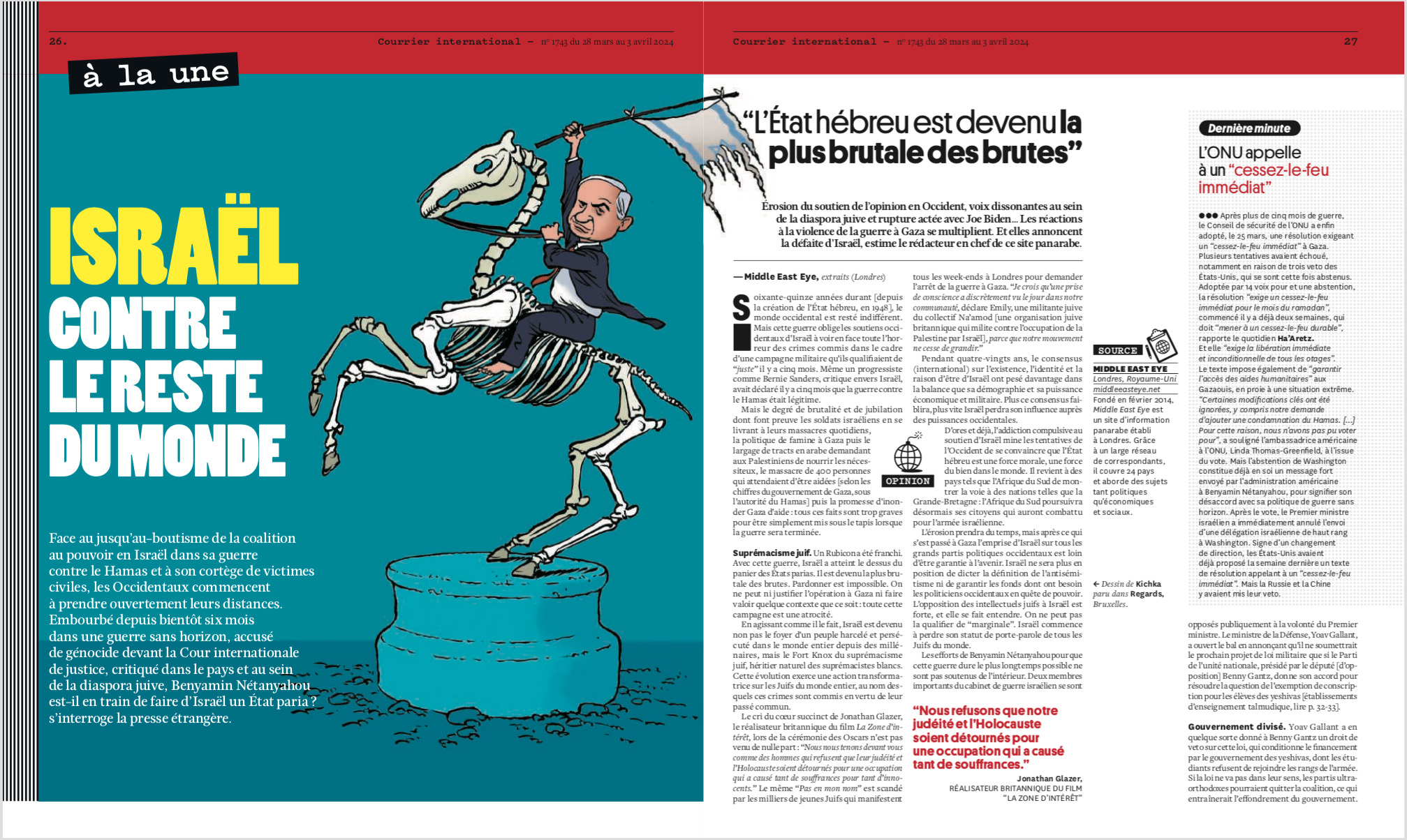 איור פותח ולכתבת תחקיר מקיפה בשבועון הצרפתי קורייה אינטרנסיונל על מצבה העגום של המדינה תחת הנהגתו של ביבי