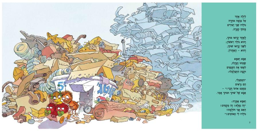 בשנה שעברה איירתי לחנה גודלברג את ספרה "שוקימוקי" עבור הוצאת הקיבוץ המאוחד. בספר, הוריהם של התאומים שוקי ומוקי מתגוררים על גבעה לא מוגדרת. בחרתי לאייר את הגבעה כמזבלה שבה המשפחה גרה לה בכיף בגביע קוטג' 5%