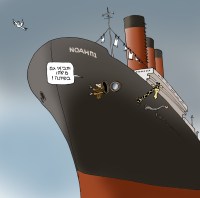 ירחון "עיניים" בנושא חלונות עומד לצאת. התבקשתי לאייר כתבה על חלונות בתנ"ך, ובראש ובראשונה החלון שדרכו שילח נח את היונה. האיור שהצעתי היה בנוי על אנרכוניזם הומוריסטי. תמיר ראונר העורך, העדיף גישה "אובייקטיבית" יותר וקלאסית יותר, כי היה לו חשוב לתת לקוראים דימוי רציני. קיבלתי זאת בהבנה. דפדפתי באיורי התנ"ך של האמן הצרפתי גוסטב דורה שאייר את התנ"ך ואת הברית החדשה במאה התשע עשרה. הוא גם אייר את דון קישוט של סרבנטס, את גרגנטואה של רבלה ויצירות רבות אחרות מספרות המופת. התבססתי על האיור תיבת נח והיונה וציירתי גירסה משלי כמחווה לאמן הקלאסי שאיוריו השפיעו על מאיירים ואמנים רבים בעולם וקבעו במידה רבה את הדרך בה מדימיינים אנשים רבים את סיפורי המקרא