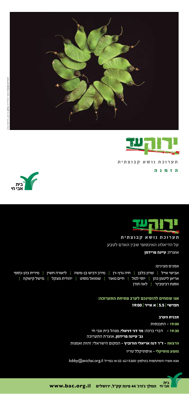 תערוכה בנושא ירוק עד המשלבת מבטים מצטלבים מתחומי הציור, הפיסול, הצילום, הוידיאו, המיצב, העיצוב והקריקטורה. באוצרותה המצויינת של עיינה פרידמן. אני ממליץ בחום על התערוכה שהופק לה קטלוג איכותי ואלגנטי ביותר